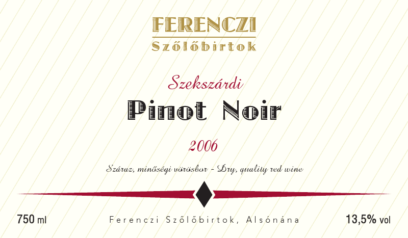 Mély lilás vörös szín. Illatában az érett erdei gyümölcsök és a vanília keveredik. A finom tanninszerkezetéhez és a lekerekedett savakhoz jól párosul a gyümölcsösség és a hordós érleléstől kapott pörkölt aromák.